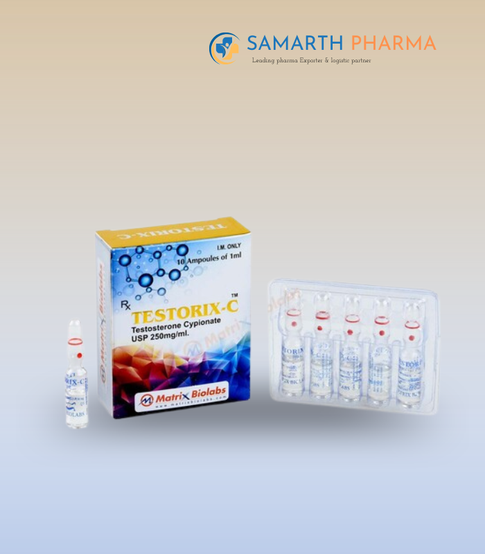 Testorix C Ampoule 250 ML contains testosterone cypionate, used for hormone replacement therapy to treat low testosterone and improve strength, energy, and vitality.